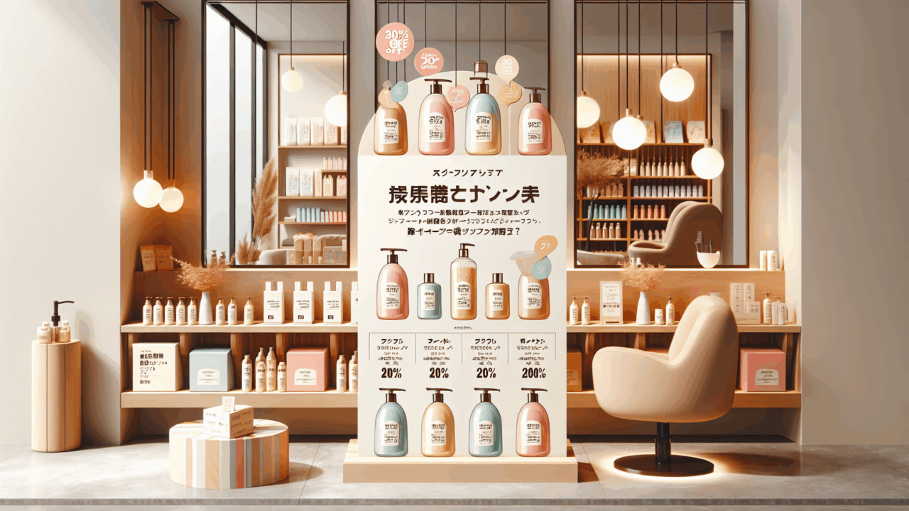 この際、告知物と一緒にサロン専売品のシャンプーやコンディショナーのボトルをディスプレイとして配置すると相乗効果が生まれます。透明感のある容器にカラフルな液体を入れれば、それ自体がインテリアとなり、お客様の興味を引きつけます。「このシャンプー、素敵なボトルですね」という会話から商品紹介につながり、物販売上の向上も見込めます。
