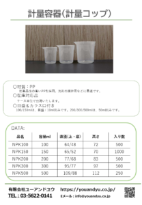 販促品・ノベルティ 計量コップ youandyu 2026年2月13日 耐薬品性に優れているPP製の計量コップのご案内です。 目盛とカラス口がついていて使い勝手のいい設計です。 比較的肉を厚くしているので、扱いやすくなっています。 理化学向けですが、家庭用洗剤の攪拌用にリテール部門でも採用実績があります。 洗剤のスポット販促として等活用ください。 ケース対応品です。 詳細はリーフをご参照ください。