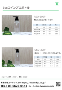 製品一覧 32Φ用PETボトル スクエアシリーズ youandyu 2026年1月19日 / 2026年1月20日 洗練されたフォルムと高い実用性を兼ね備えた、 PET製インブロボトルの角型タイプが新登場。 シャープなスクエア形状が、製品の存在感とブランドイメージを際立たせます。 PET素材ならではの軽量性・透明性・耐久性を活かし、 ヘアケア、ボディケア、日用品など幅広い用途に対応。 内容物の美しさを引き立てるクリアな外観で、売り場での視認性も抜群です。 スクエアタイプのボトル2種類をリーフに纏めました。 ☆肩の張ったデザイン ☆肩Rの丸みを出したデザイン 3ccスクエアボトル 容量も300/400/500mlがございます。